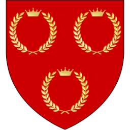 Gules, in three compositions, placed 2 and 1, each of two opposite laurel branches in the shape of a circle, decussed at the tip and separated at the head by a crown, all in gold.